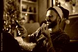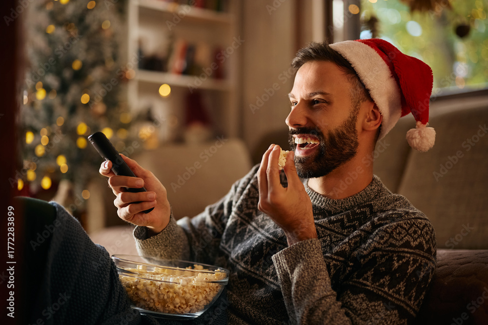 Cheerful man watching movie on TV while spending Christmas at home.