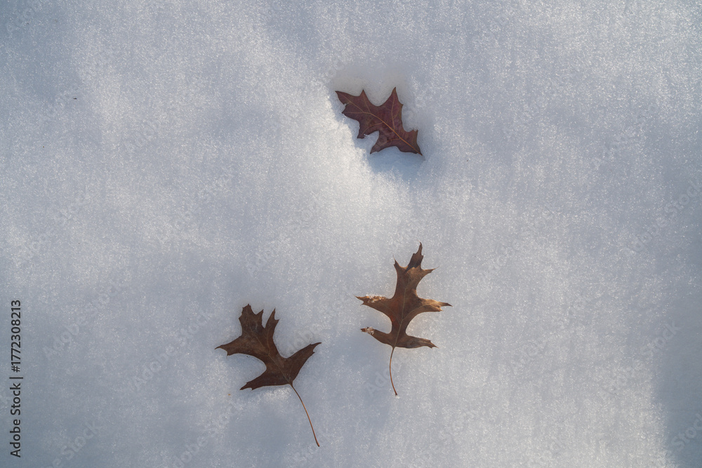 Frost leaf on snow surface. Autumn leaves in wintertime . Frozen autumn leaf on snow surface. Snowy fallen leaves. Frosty leaf. Winter leaf on snow. Leaves covered in snow. Autumnal winter mood.