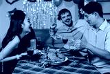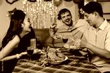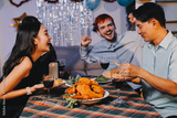 Diversity, dinner and group of people toast celebration together at party. Friends, happy and celebrate with food, wine and friendship for love, support and cheers champagne at business function