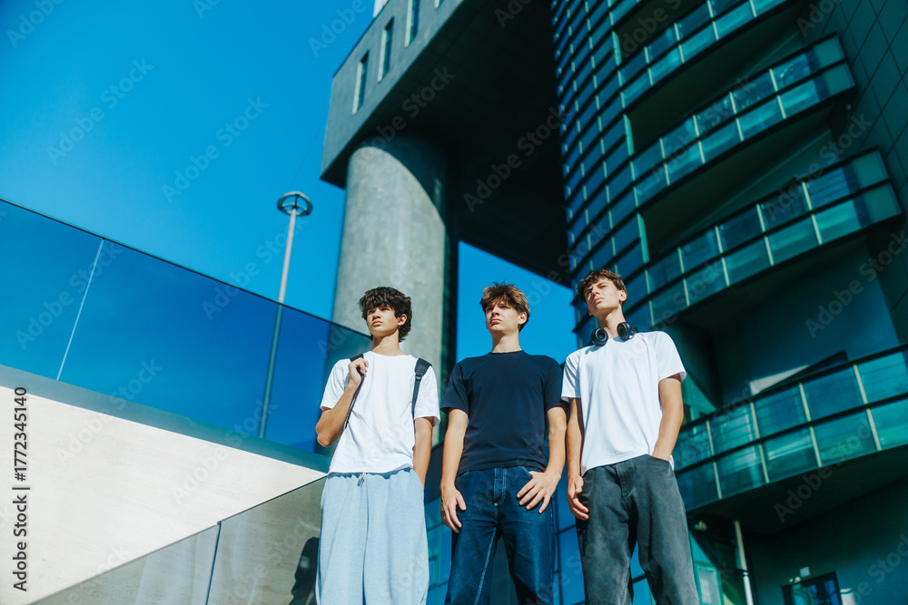 Three stylish teenage friends pose outdoors against an urban backdrop. Dressed in casual tees and jeans