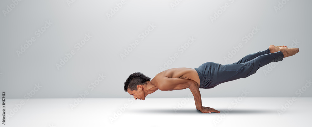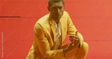 Posing mid adult model in yellow tailored suit and white shirt crouching in studio, glitch backdrop