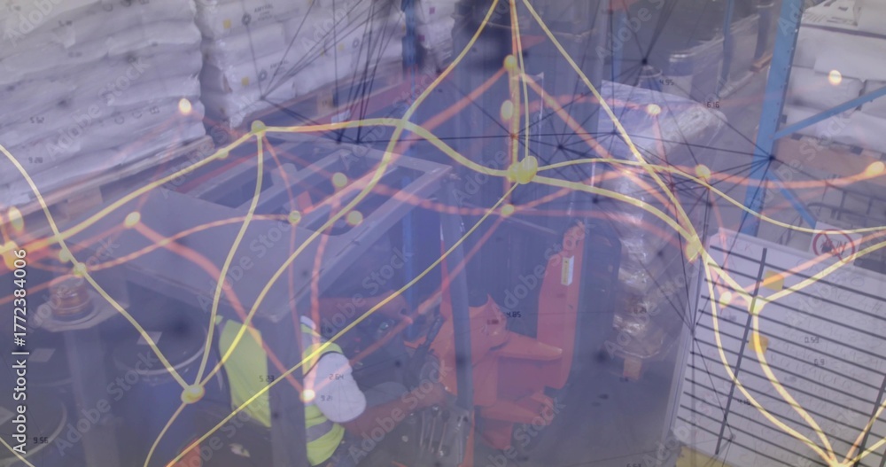 Forklift operator wearing safety gear lifting pallets of sacks in warehouse, with network overlay