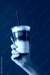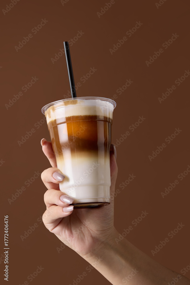Hand holding iced latte in plastic cup with straw on brown background. Concept of barista craft, beverage composition, product presentation for cafe advertising and packaging design.