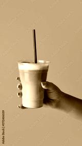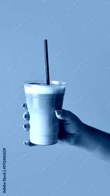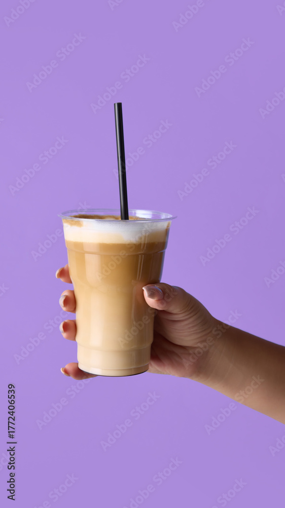 Hand holding latte in transparent cup with straw on purple background for beverage marketing. Concept of barista craft, product presentation, ads composition used in cafe branding and menu design.