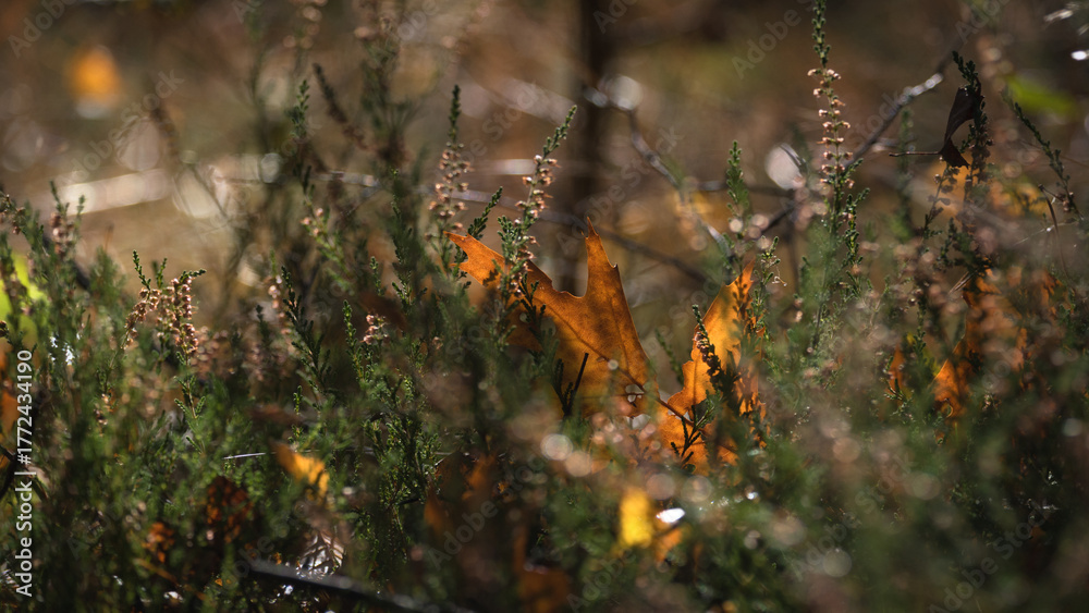 A SUNNY AUTUMN MORNING - A yellowed maple leaf among the common heather in a forest clearing