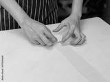Close-up hand of asian young woman rolling dough into rolls with butter for homemade bread cooking on table in kitchen home, preparation ingredients desserts process making buns manually bakery baking