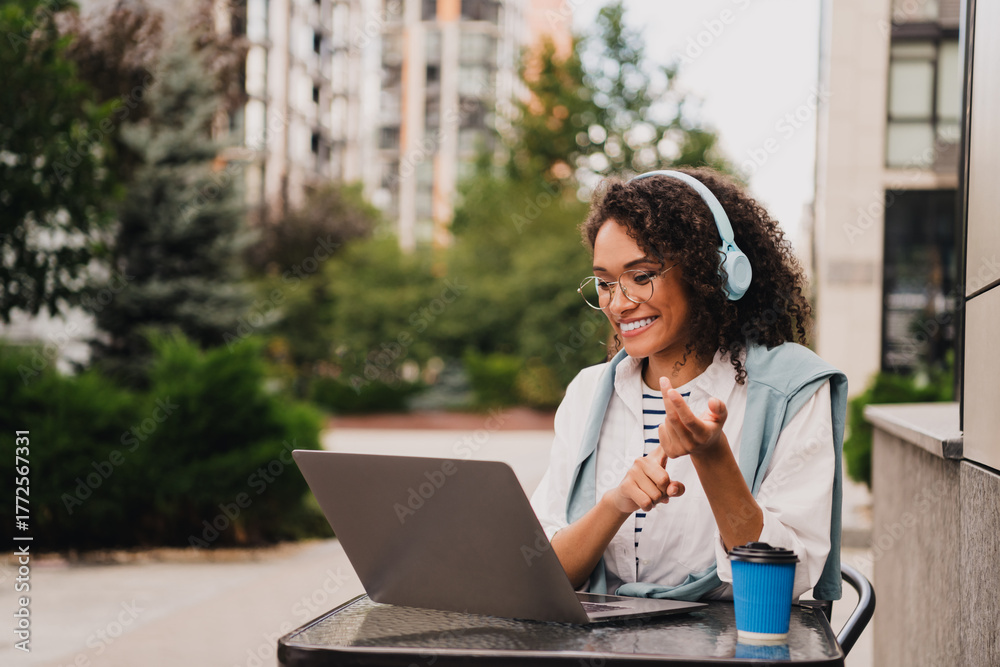 Young woman with headphones working on a laptop outdoors at a modern city cafe enjoying a sunny urban day in summer