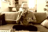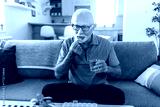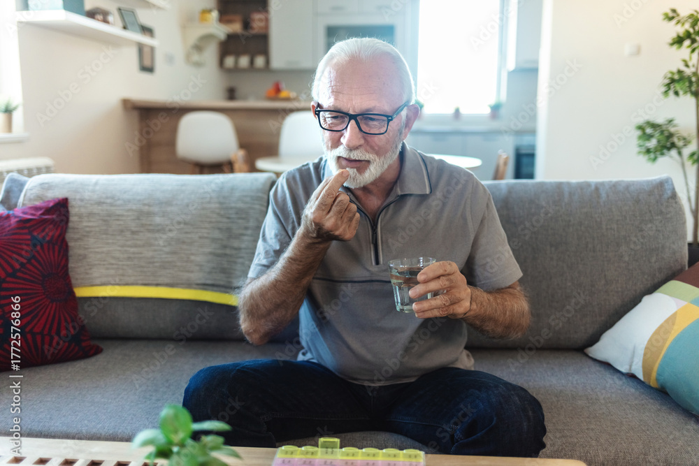 Smiling senior man sitting at a table in his home, taking daily medication from a blister pack while having a glass of water nearby, embracing a routine of health and wellness.