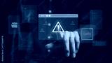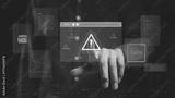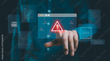 Data protection and cybersecurity system warning alert. Business hand touching a holographic warning icon, data breach, malware attack, digital security, and technology protection.