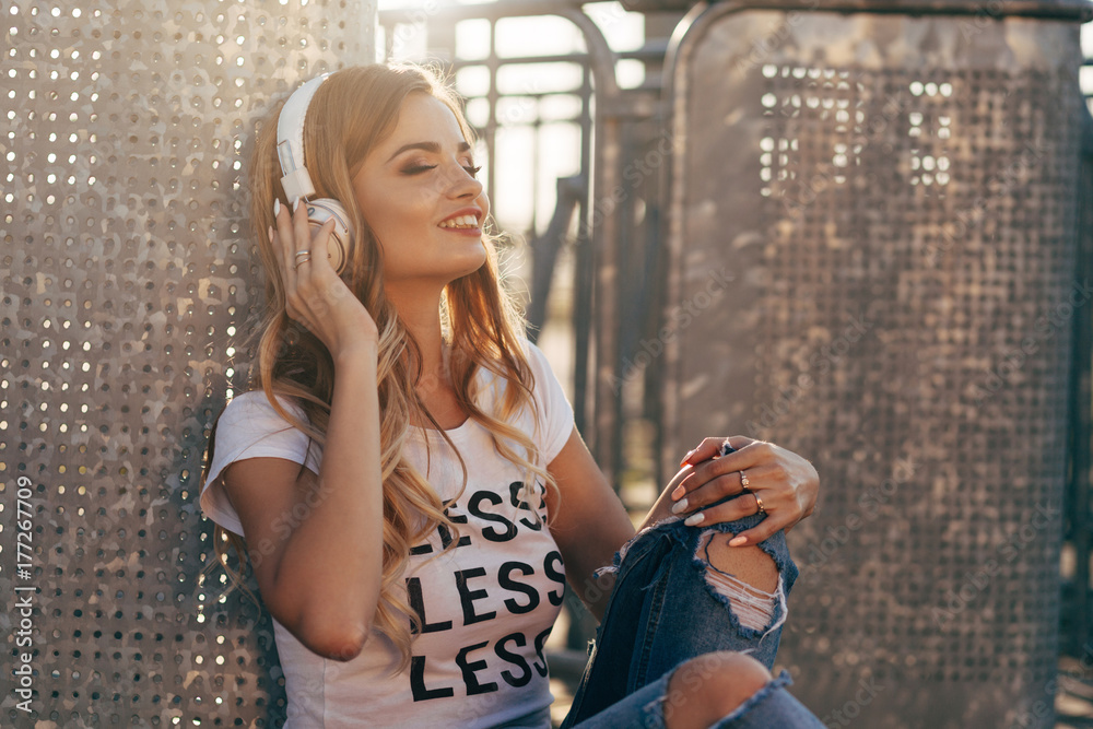 Young smiling woman in a white T-shirt with word "less" listening music and sitting on the pavement