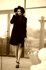 Beautiful happy woman is wearing fashion clothes and hat near airport building with pink suitcase. Concept photo of people travel.