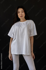 Studio portrait featuring composed model facing camera with soft lighting and minimalist background