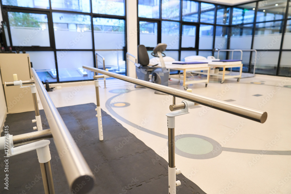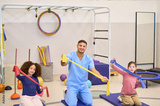 Pediatric Physiotherapy Session with Children and Therapist, Rehabilitation Exercises with Resistance Bands, Motor Skills Training in Pediatric Rehab Center, Balance Training