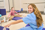 Pediatric Physiotherapy Session with Therapist and Child, Rehabilitation Exercises for Motor Skills, Balance Training in Pediatric Rehab Center, Smiling and Encouraging