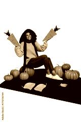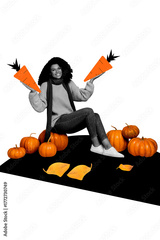Sketch image trend collage of autumn season happy thanksgiving day young lady smile sit pumpkin hand hold carrot grocery harvest vegetable