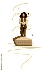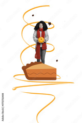 Sketch composite trend 3D collage of autumn thanksgiving day tradition feast greeting card young lady cook cupcake pumpkin vegetable tasty