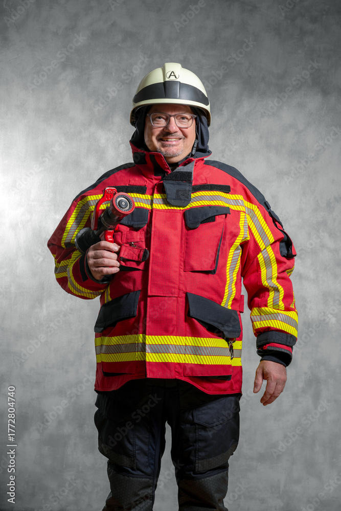 Feuerwehrmann in Einsatzuniform mit Hohlstrahlrohr für die Brandbekämpfung, Studioaufnahme vor Betonwand.