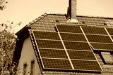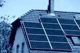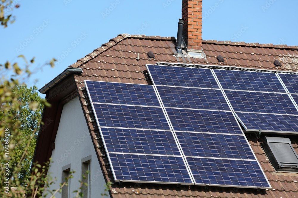 Solar panels on generic house roof. Photovoltaic energy generation near Essen, Germany.