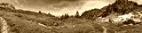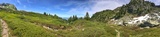 Wide mountain panorama featuring lush greenery, rocky hills, and distant snow patches