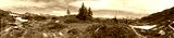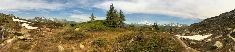 Wide panorama of alpine landscape with snowy mountains and grassy terrain