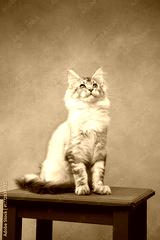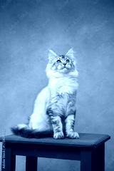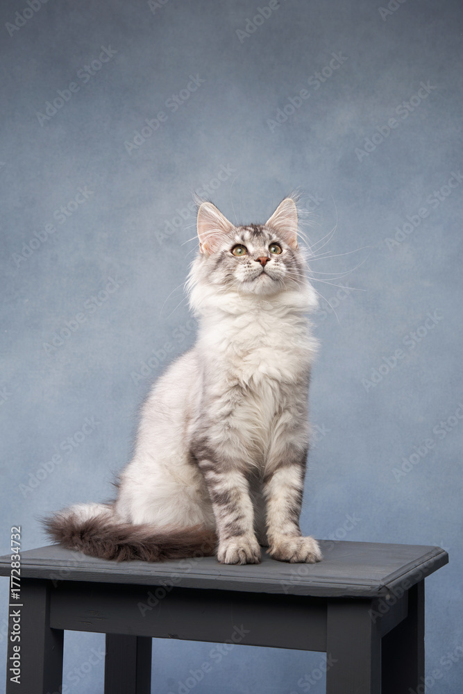 A white Maine Coon kitten sits on a wooden platform, gazing into the distance. The blue-toned background highlights its soft fur.