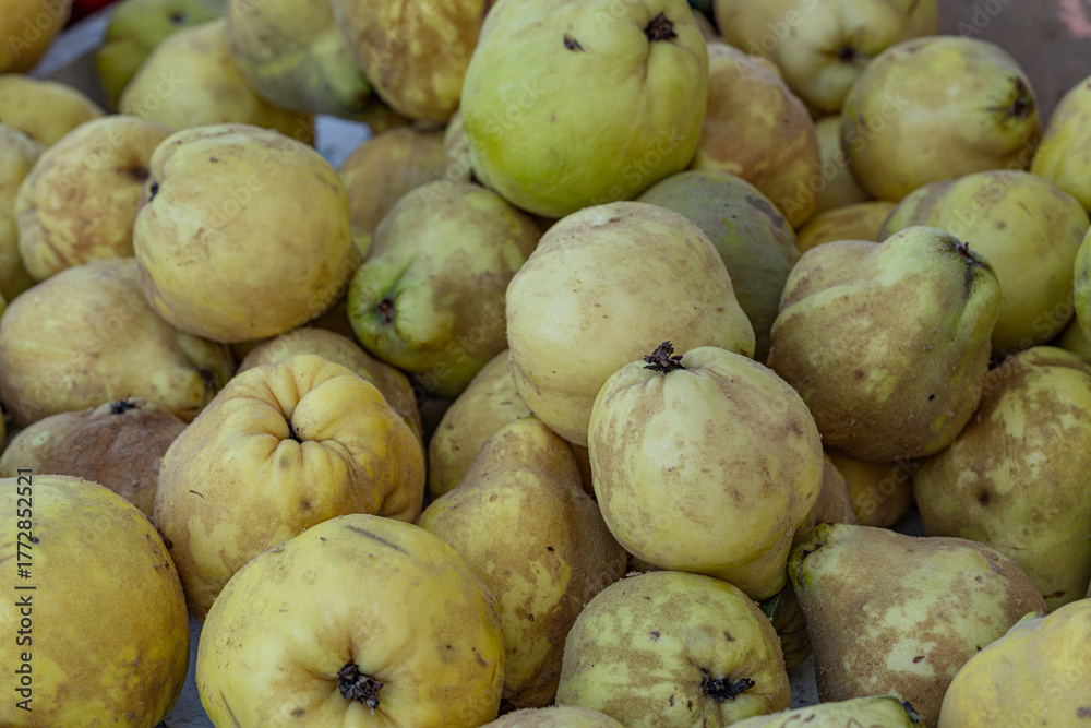 Heap of ripe quinces at a farmers’ market, fuzzy yellow skins and natural blemishes; selective focus conveys fresh produce authenticity and an organic fruits lifestyle vibe.