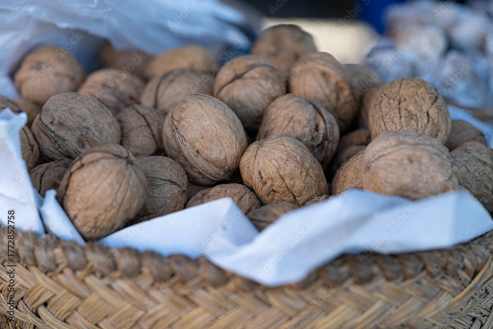 Woven basket brimming with unshelled walnuts, parchment lining and selective focus evoke artisanal farmers’ market charm, fresh produce and organic fruits lifestyle appeal.