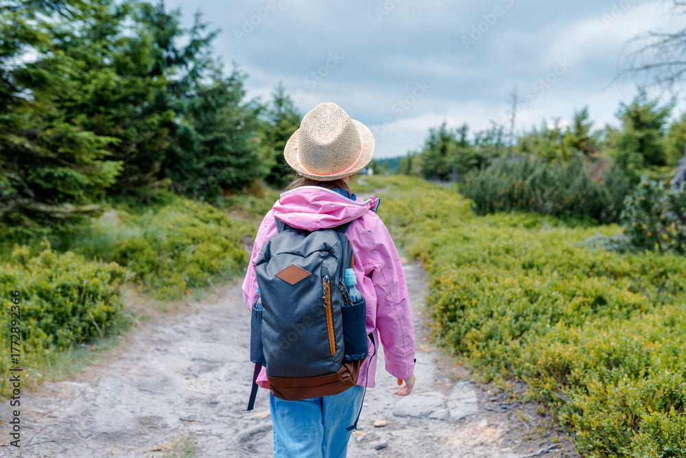 Rear view of a child hiker wearing a straw hat, pink jacket, and large backpack walking on a mountain forest trail, concept of outdoor adventure, youth travel, summer trekking, and nature exploration