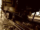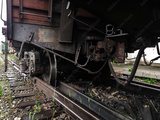 A derailed carriage. An accident on the railroad. A railway carriage that derailed on a sunny day. As a result of the train accident, the train derailed. Derailment of railway wagons.