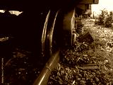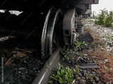 An accident on the railroad. A railway carriage that derailed on a sunny day. A derailed carriage. Derailment of railway wagons. As a result of the train accident, the train derailed.