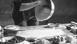 Hands skillfully pour flour onto a wooden surface, surrounded by ingredients for cozonac