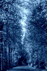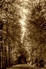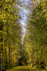 Sunlit path leading through a tunnel of trees with vibrant yellow autumn foliage