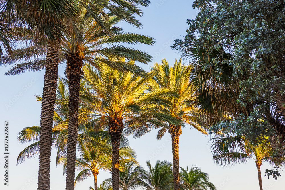 Close up view of tropical palm trees with green leaves shining in sunlight against blue sky with white clouds background. Miami Beach. USA.
