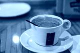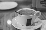 Close up view of hot espresso with thick crema in white ceramic cup on saucer placed on wooden counter in cafe. Miami. USA.