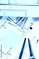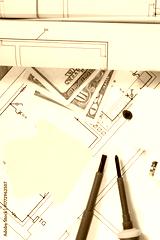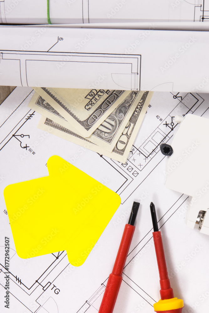 Electrical components for installation, work tools, paper in shape of house and dollar baknotes. Electric construction diagrams. Planning build or buy home