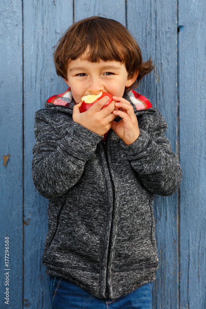 Kind Apfel Obst Früchte essen Hochformat draußen Herbst gesunde Ernährung