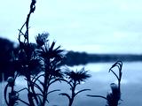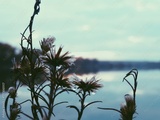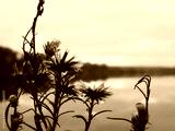 Dried lakeside wildflowers at dusk with soft pastel reflections