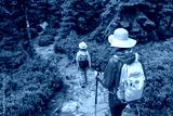 Rear view of a mother and child hiking on a rocky forest trail, wearing sun hats and backpacks with trekking poles, waymarked path through green conifers, concept of family adventure, bonding