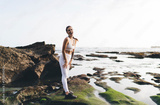 Woman laughs with relaxed body posture after movement session, expressing emotional wellness, confidence and connection to body in a screen-free, intentional lifestyle