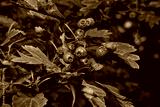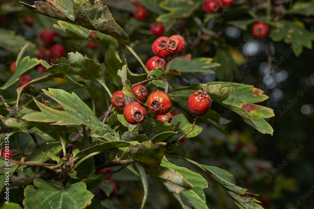 Ripe hawthorn fruits hanging on a branch among dense foliage. Natural seasonal background for health and nature illustrations. Macrophotography of hawthorn fruits on a background of green leaves.
