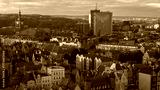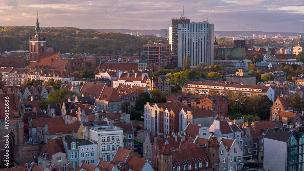Aerial view of Gdansk historic core with St. Mary's Church and river