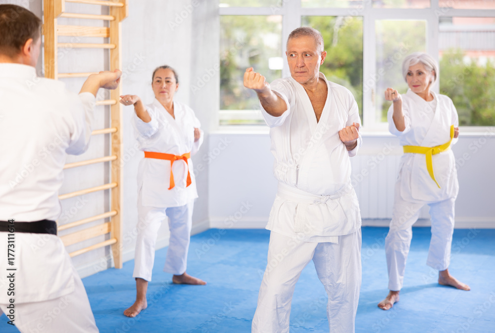 Diligent old man attendee of karate classes practicing kata standing in row with others in sports hall
