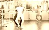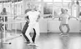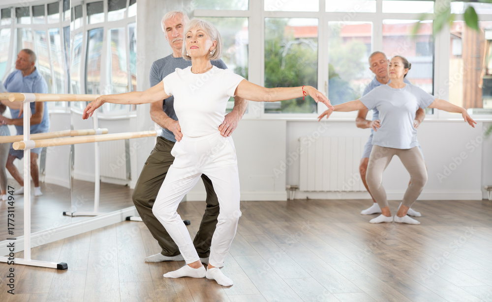Active dancing mature pair engaged in group classes in studio perform demi plie pose in modern ballet studio
