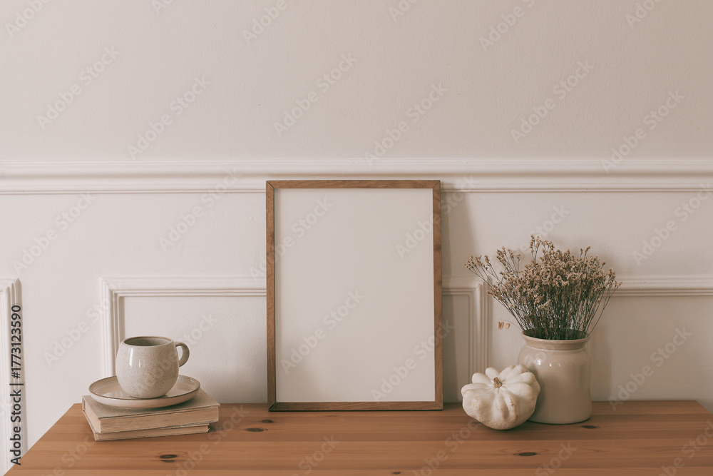 Minimalist home interior still life. Blank wooden picture frame, poster mockup on table. Dry limonium flowers in ceramic vase. Coffee cup on books, white pumpkin. Scandinavian living room
