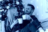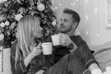Happy young couple lovers enjoy time spending together, sitting on sofa at home near Christmas tree, hugging and holding white cups with hot tea or coffee with marshmallow. High quality photo