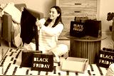 Young woman with new clothes sitting on floor at home. Black Friday sale