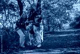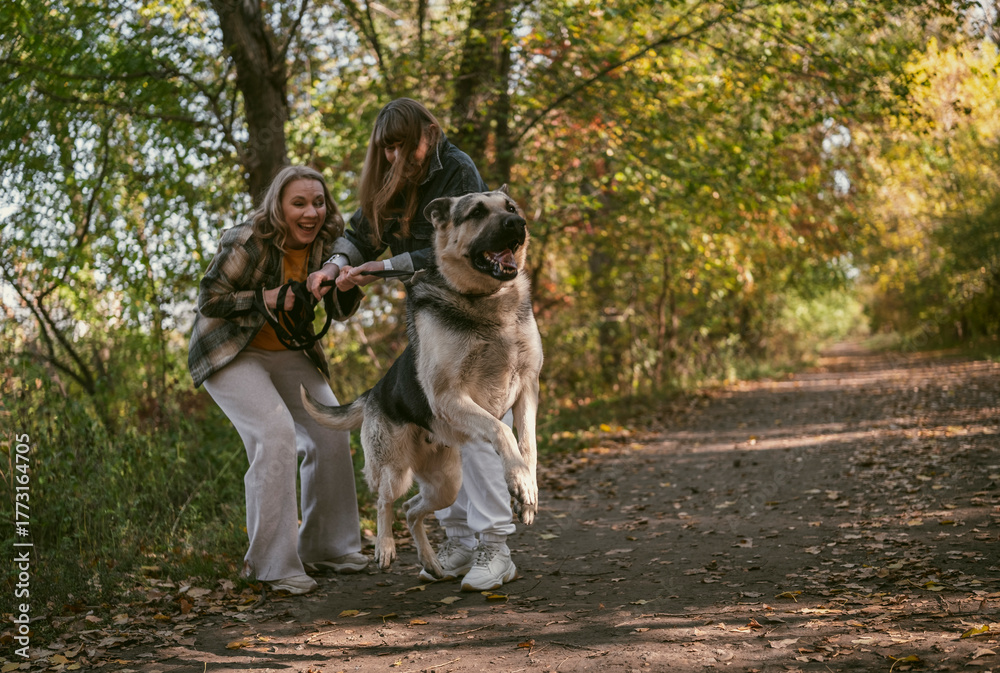 Two women play with large dog on winding path surrounded by colorful autumn trees. Laughter fills the air as the dog leaps happily, creating a cheerful scene in nature