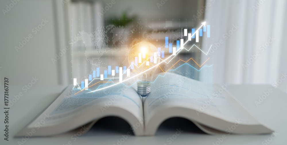 An open book with a glowing light bulb and digital graph illustrates concepts of growth, knowledge, and innovation in various sectors, perfect for educational or business use. Impute
