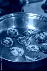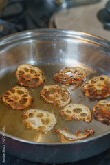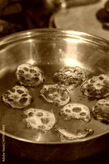 蓮根のスライスを油で揚げる・レンコンチップス