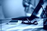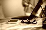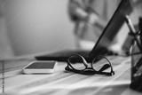 Workspace setup featuring glasses and smartphone in a minimalistic environment during daytime
